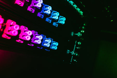 A close-up shot showcasing vibrant colorful lighting effects on electronic components. The image features an abstract play of light and color, ideal for technology themes.