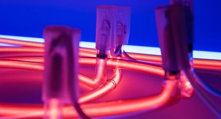 Blue and purple fluorescent lights suspended from ropes. Modern ultraviolet noen lighting. 3d illustration