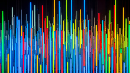 Abstract image featuring a series of bright, colorful vertical lines against a dark background, creating a dynamic and modern visual effect.