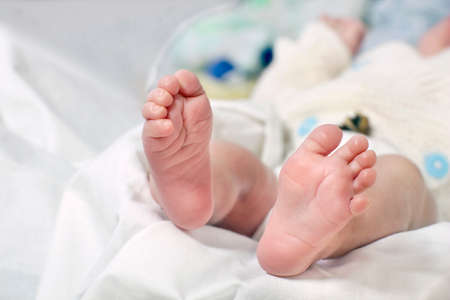 newborn legs close up. Child birth, first day in hospital, newborn baby wearing diaper in postpartum department.