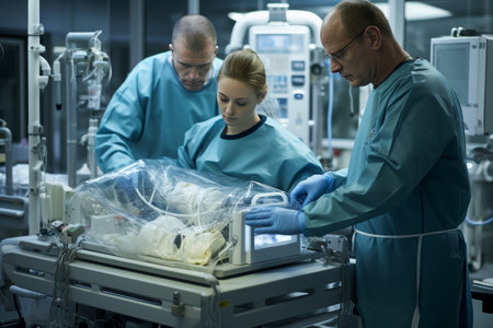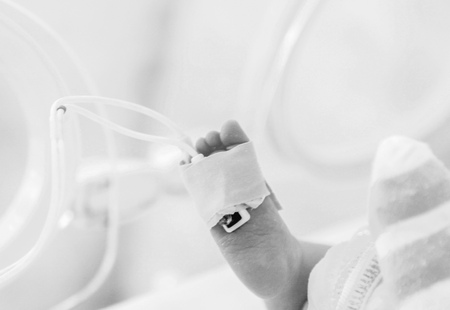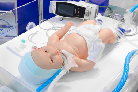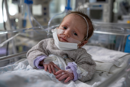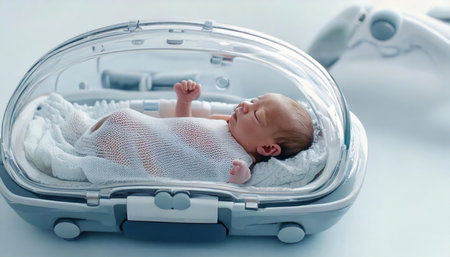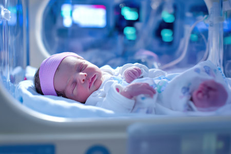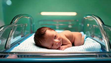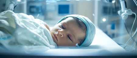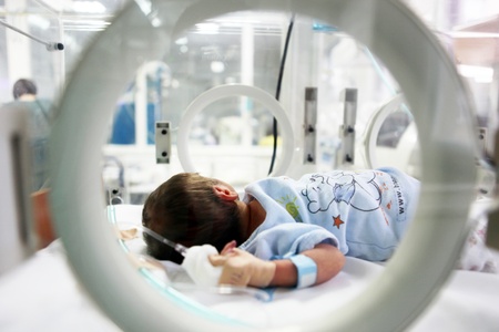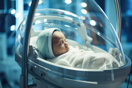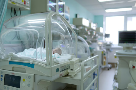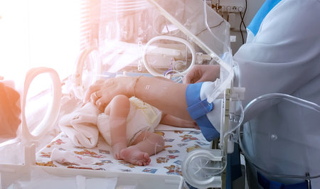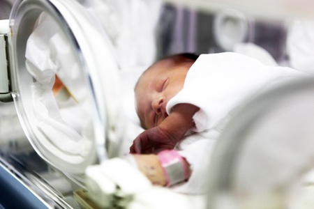 Newborn in incubator receiving medical care in hospital nursery during daytime hours