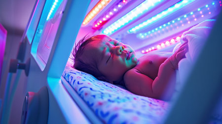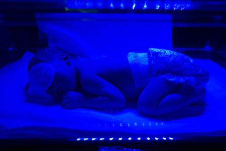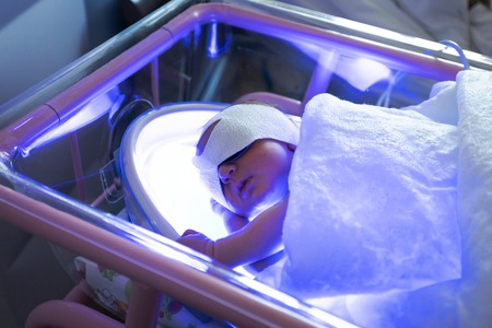 Newborn having a treatment for jaundice under ultraviolet light in incubator
