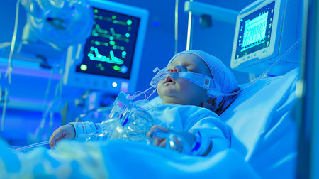 A newborn baby lies in boxes in the hospital. A child in an incubator. Neonatal and Premature Intensive Care Unit