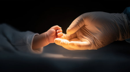 Doctor's hand holds the handle of a newborn baby. Macro photo without a face. Photo in the intensive care unit of the hospital. Life saving concept. Photo indoors.