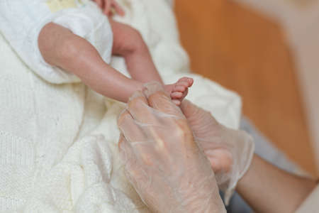 Newborn baby in intensive care unit in the hospital. Doctor's hands put a measuring medical device on a baby s leg. Macro photo of the hands of a doctor and the legs of a newborn baby. Photo in the interior.
