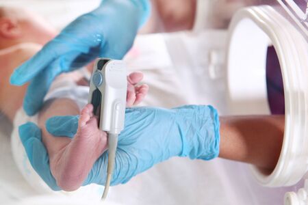 Newborn neonatal infant pulse oximeter premature baby. Children inside incubator.