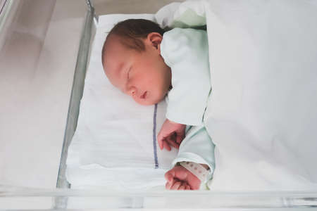 A newborn baby with a maternity hospital bracelet on his arm is sleeping in a crib. A newly born child in a clinic bed behind a transparent glass