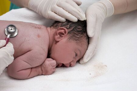 Newborn child seconds and minutes after birth. Doctor hands with new born baby. Medical check up of health and reflexes of child. New life, beginning, healthcare
