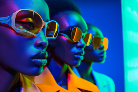 A beautiful black female model wearing a stylish yellow jacket and sunglasses poses against a vibrant pink and orange background. Perfect for fashion, beauty, and lifestyle concepts.