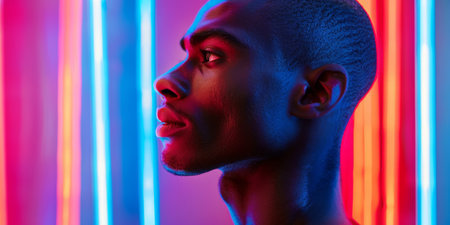 Portrait of a young african man at studio. Fashion male model in colorful bright neon lights.