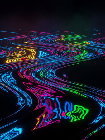 This digital artwork showcases a dynamic blend of neon colors and electric lighting, creating a futuristic and energetic mood. Perfect for enhancing nightlife and entertainment promotions, event posters, and digital media. The abstract style appeals to modern designers and marketers in the entertainment industry. AI-generated digital illustration. AI-generated illustration.