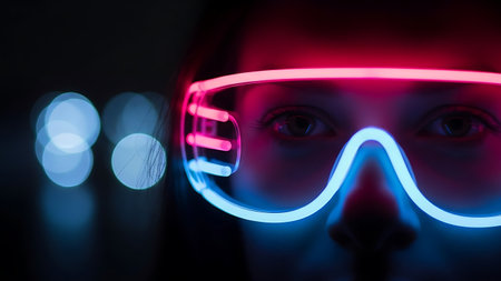 The image depicts a person wearing neon goggles that emit bright blue and red lights. The goggles cover their eyes, creating a futuristic and vibrant look. The background is dark with blurred lights, suggesting a nighttime setting or possibly a party atmosphere. The person's face is not clearly visible, focusing the attention on the illuminated goggles.
