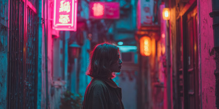 A figure stands in a narrow alley filled with vibrant neon signs. The atmosphere is lively at night, with colorful lights reflecting on the walls. The scene feels mysterious and inviting.