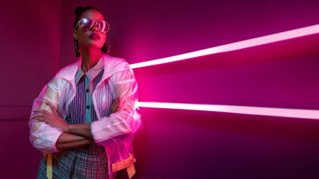 In a vibrant urban environment illuminated by neon lights, a young woman exudes confidence with her striking look. Dressed in stylish attire, she captures the essence of city life.