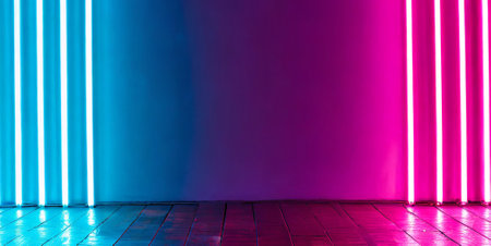Capture the vibrant energy of colorful neon lights illuminating a space with a modern aesthetic. Perfect for backgrounds or artistic projects.