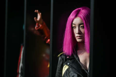 Image of a beautiful young woman posing against a led panel. teenager with alternative look and gray wig making urban portraits