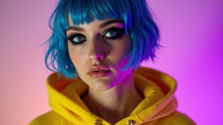 Young caucasian female with blue hair in yellow hoodie and dramatic makeup against purple background.