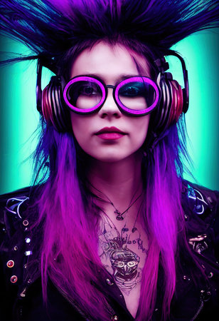 Realistic portrait of a fictional punk girl with headphones and pink hair. Hipster girl with punk hair. 3D render