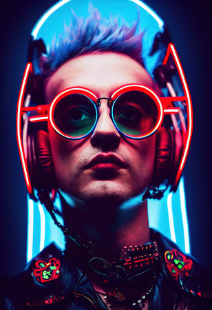 A young man with a punk-inspired hairstyle and leather jacket poses under bold neon lighting, creating a rebellious, futuristic vibe.