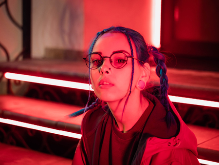 Young pretty girl with unusual hairstyle near glowing crimson red neon light of the city at night. Dyed blue hair in braids. Pensive hipster teenager in glasses.