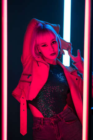 Beautiful girl dancing in retro wave on the neon light. Fashion portrait of trendy young woman in leather jacket, blue and purple light on her face