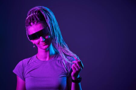 Girl with dreadlocks in colorful neon lighting on dark background. Stylish young woman in futuristic environment.