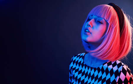 Young stylish girl in the Studio on a colored neon background. Music dj poster design. Portrait of a young girl dancer.