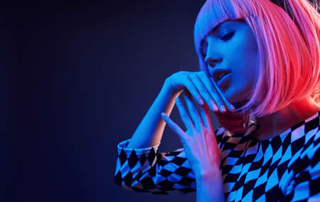 Amazing woman with dyed pink hairstyle dancing on led-colorful neon lamps background. Charming lady, night life concept. Modern pop outfit, influencer lifestyle.