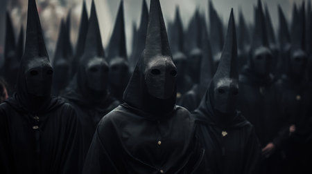 Mysterious cloaked figures move silently through dense fog in a dark and eerie atmosphere.