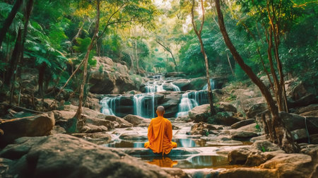 Monks in orange robes sit in meditation at a Buddhist temple, surrounded by peaceful nature and an ambiance of tranquility on a calm morning.