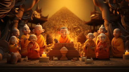 AI Generative People on Asian Buddhist holiday Mahayana New Year, monks in color orange robes