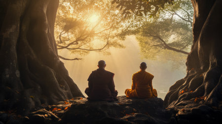 Monks in deep contemplation embodying tranquility and spiritual devotion to Buddhism. Concept Buddhist Monks, Contemplation, Tranquility, Spiritual Devotion, Buddhism