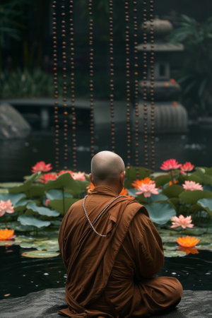 A Buddhist monk in deep meditation beside a serene lotus pond, with prayer beads and incense, symbolizing tranquility.
