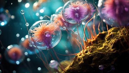 a close-up portrait photograph showcasing the intricate details of unknown escherichia coli biological virus alien flowers. the image captures the brittle yet beautiful essence of these flowers, with dry and elegant petals. the rich and vivid contrast, along with the depth of field and black tones, creates a crisp and realistic depiction. shot on a 100mm lens with an aperture of f/2.0, the natural lighting