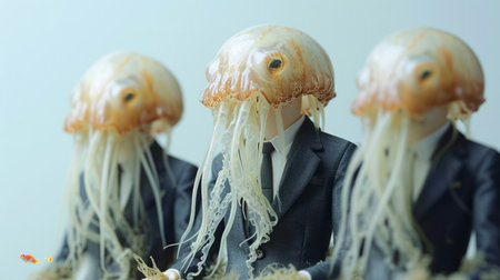 A comical image of a group of artificial jellyfish dressed in professional attire, ready for a business meeting.