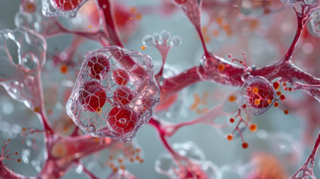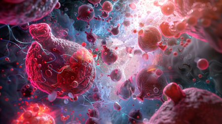 A stunning close-up view of colorful microscopic cell structures showcases the intricacies of life at a cellular level. This vibrant biological environment features various cell types and interactions, perfect for educational and scientific purposes.