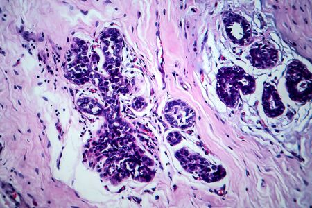 Ovarian cancer, light micrograph, photo under microscope. Photograph shows a fragment of a cancerous tumor in the female ovary. Selective focus