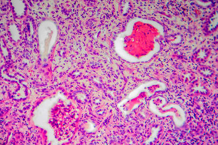 Histopathology of acute nephritis, light micrograph, photo under microscope