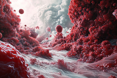 Numerous red balls are suspended in mid-air, creating a compelling visual scene, Fantasy-style scenery created from different types of blood cells, AI Generated
