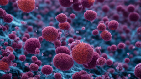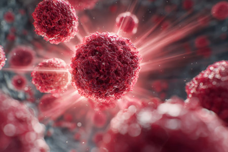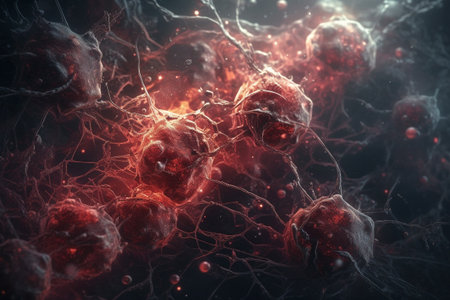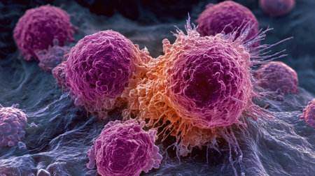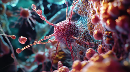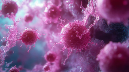 Stunning macro imagery that captures the fascinating details of cancer cells within a dynamic environment, showing their complex structure and unique characteristics