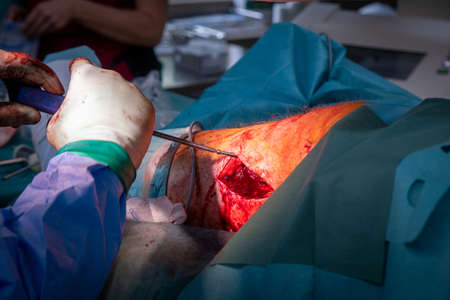 Close up of patients wound and medical workers hand in sterile gloves doing abdominoplasty surgery. Plastic surgeon and assistant using medical instruments. Concept of medicine, abdominoplasty.