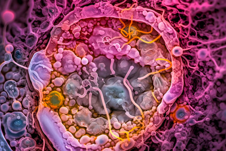 A detailed illustration showcases a colorful cell with filaments and textures, highlighting its complex structures and biological features in a laboratory environment.