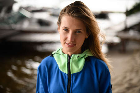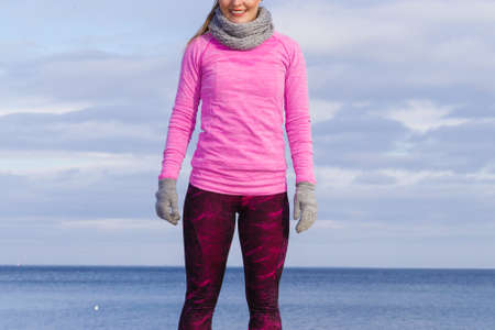 Woman resting relaxing after doing sports outdoors. Fitness girl female jogger wearing warm sporty clothes in cold day weather on seaside taking break