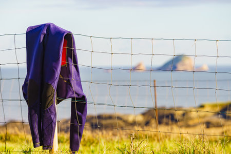 Diving suit hanging to dry on the beach. Wetsuit against coast landscape. Swimming equipment with sea view.