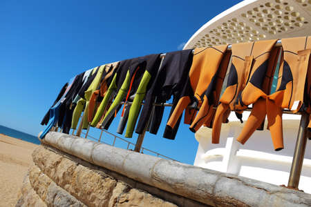 Diving suit to dry on the beach. Wetsuit on the shore. Swimming equipment.