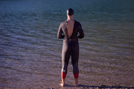 Professional triathlete before swimming in rivers open water. Man wearing swim equipment practicing triathlon on the beach in summers day.