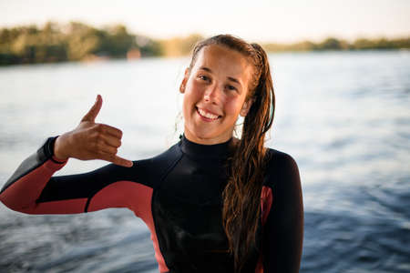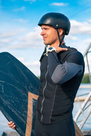 Portait of wakeboarder making ready of surfing on lake. Happy surfer wearing wetsuit of wakeboarding in the cable park. Water sport, outdoor activity concept.