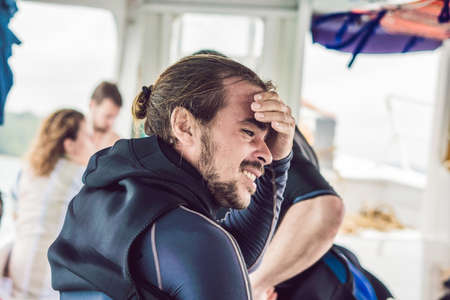 Portrait of bearded male in scuba diving mask and orange neopren diving suit isolated on grey background.