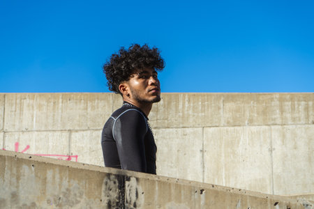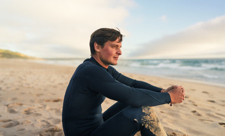 Close-up of young surfer standing at the beach with his surfboard and wearing black surfing suit. Sport and water sport concept.