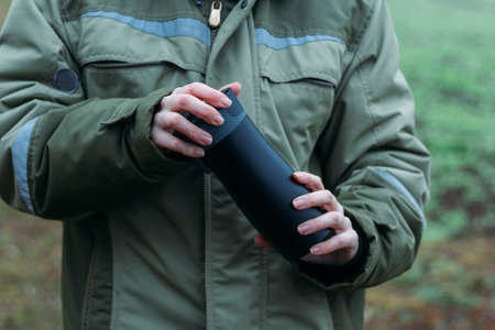 Women's hands are warming themselves on a black toggle switch with a hot drink in late autumn. Eco-friendly use of reusable glasses